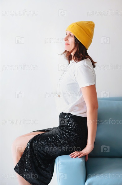 Стильная женщина сидит на диване