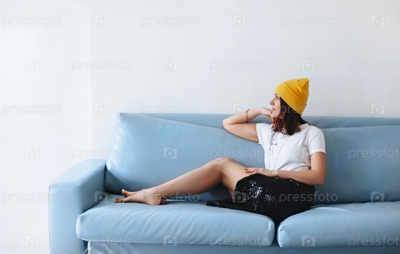 Стильная женщина сидит на диване