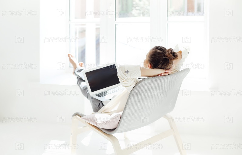 Молодая женщина отдыхает с ноутбуком