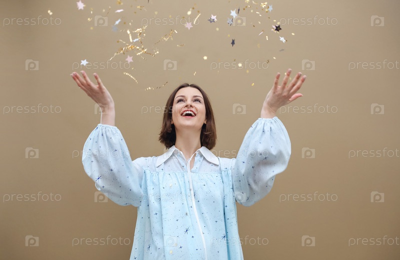 Счастливая молодая женщина смотрит вверх, улыбаясь рядом с золотым конфетти на бежевом фоне