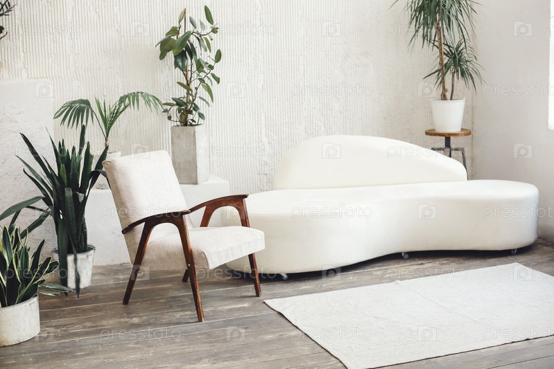 Современный интерьер гостиной с уютной мебелью, украшенной растениями в горшках