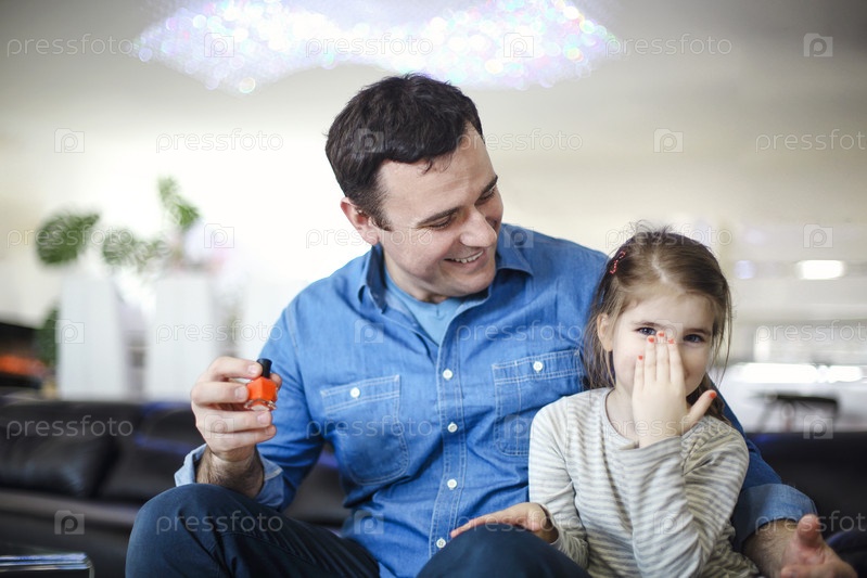 Веселый отец играет с маленькой дочерью, сидящей на диване и помогающей красить ногти ярким лаком, играя вместе