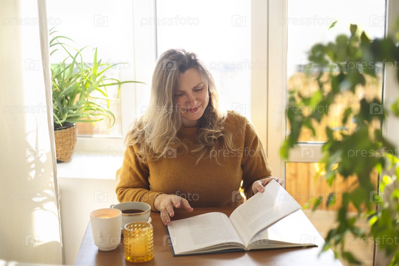 Писательница или поэтесса средних лет пишет в блокноте, сидя за столом в солнечной комнате дома, создавая роман или стихи