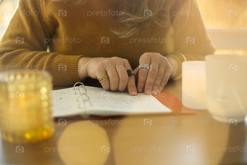 Писательница или поэтесса средних лет пишет в блокноте, сидя за столом в солнечной комнате дома, создавая роман или стихи