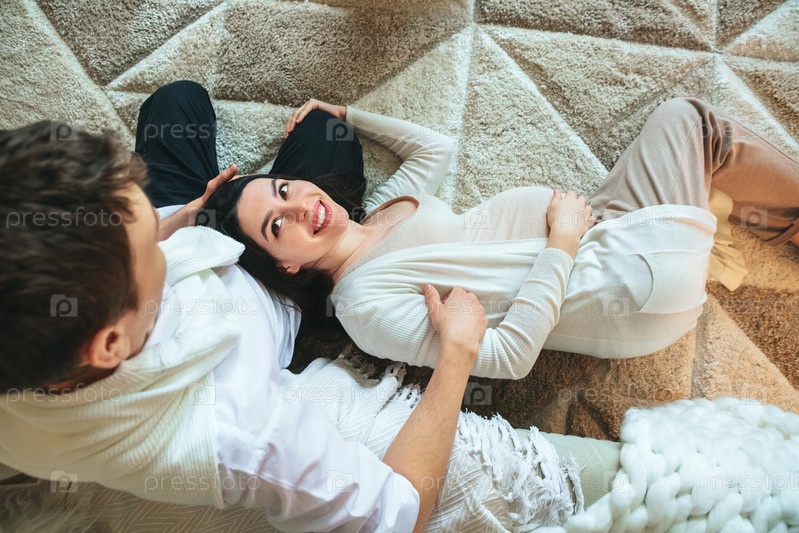 Молодая семейная пара ждет ребенка. Вид сверху на любящего мужа, обнимающего беременную жену во время совместного отдыха дома, мужчину и женщину, будущих родителей