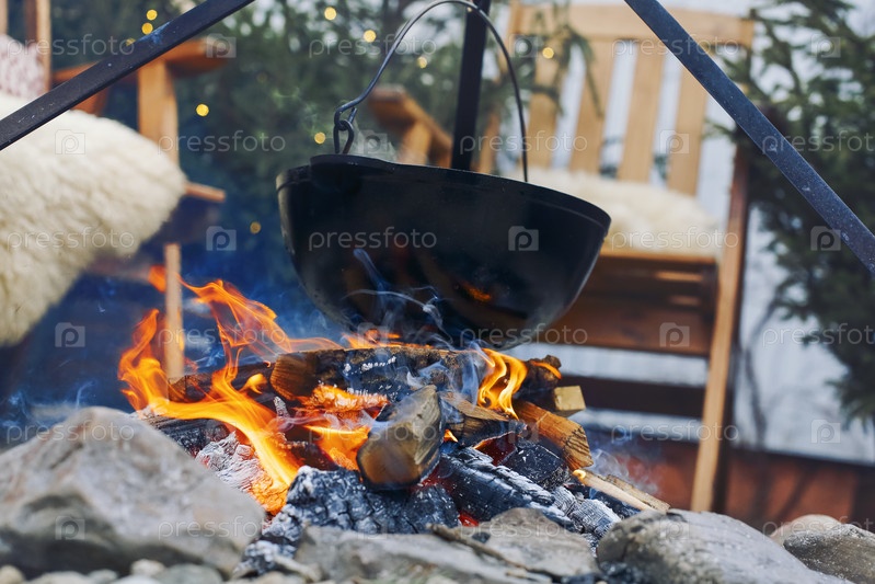 глинтвейн с дольками апельсина, приготовленный в горшке над горящими бревнами