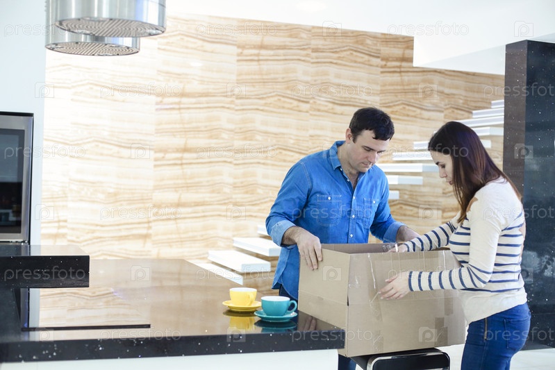 Счастливая семейная пара распаковывает личные вещи из картонных коробок, одетые в повседневную одежду