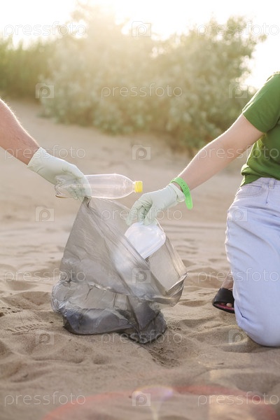 Волонтеры собирают на пляже мусор, пластиковые мусорные бутылки. Концепция экологии, окружающей среды, загрязнения и экологических проблем