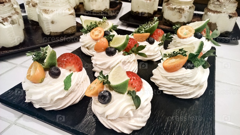 Десерты Анны Павловой на черной тарелке и банки тиррамиссу на заднем плане