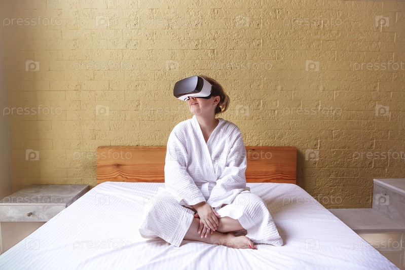 Ошеломленная молодая женщина просыпается в белой кровати с очками виртуальной реальности, потрясенная женщина просыпается в гостинице или спальне дома, испытывая VR-очки