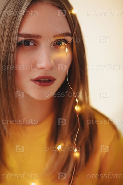 Молодая красивая брюнетка с закрытыми глазами и улыбкой на лице позирует со светодиодными огнями в волосах