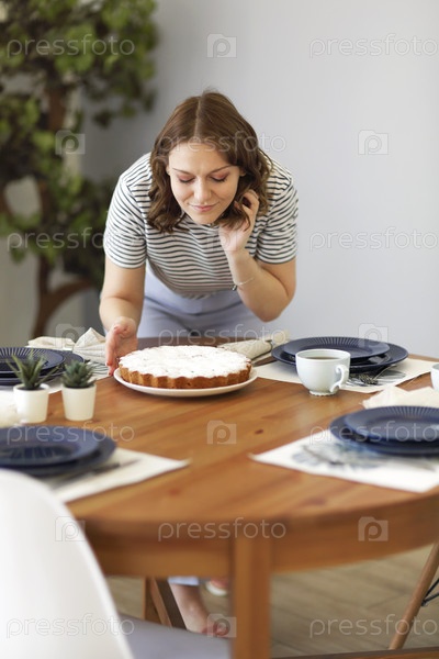 Молодая женщина нюхает свежий торт