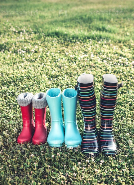 Красочные резиновые сапоги на зеленой траве