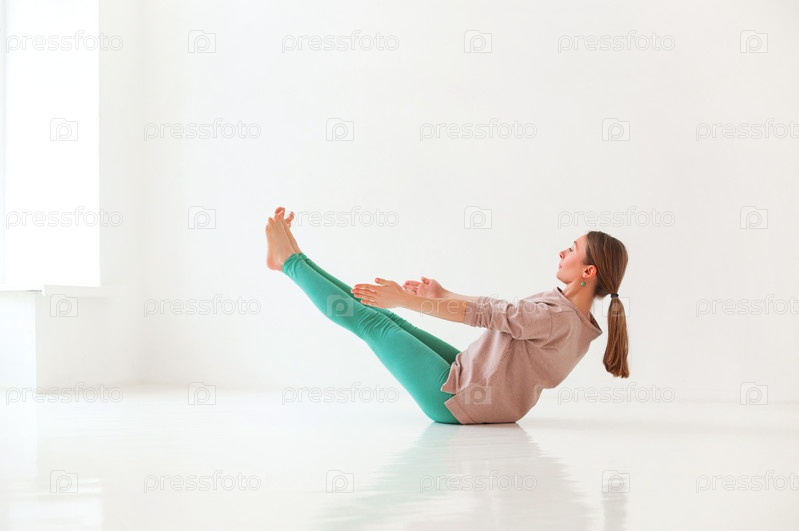Гибкая женщина занимается йогой дома