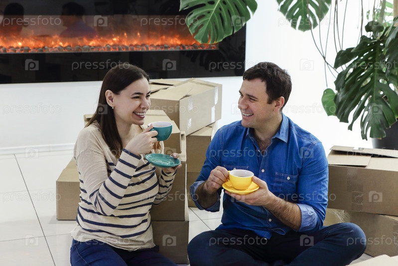 Молодая пара отдыхает в день переезда в новый дом, сидя на полу