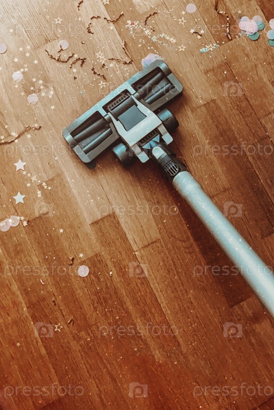 Сопло пылесоса на паркете деревянного пола с конфетти, уборка после рождественских праздников