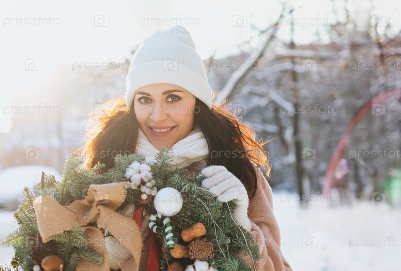 Брюнетка с рождественским венком на снегу