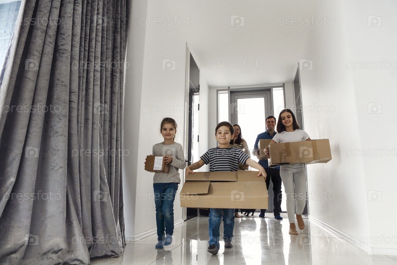 Счастливая семья работает в зале. Смешные дети прыгают с картонной коробкой, родители смеются,