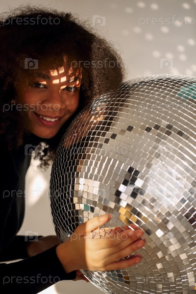 Молодая счастливая довольная афро-американская кудрявая девушка с блестящим серебряным диско-шаром