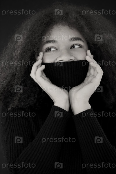 Довольная афро-американская кудрявая женщина с закрытыми глазами, закрывающая лицо теплым черным воротником свитера