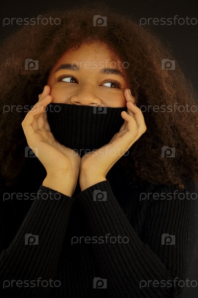 Довольная афро-американская кудрявая женщина с закрытыми глазами, закрывающая лицо теплым черным воротником свитера