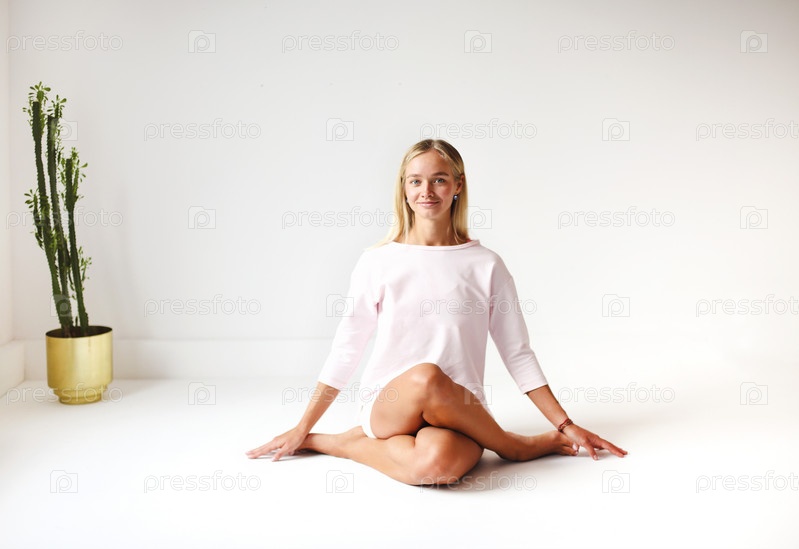 Гибкая женщина занимается йогой дома