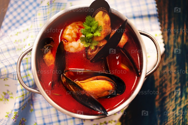 Чаша с супом из морепродуктов в кафе