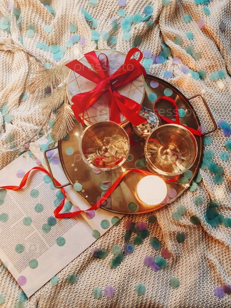 Подарок и украшения на кровати во время празднования Рождества
