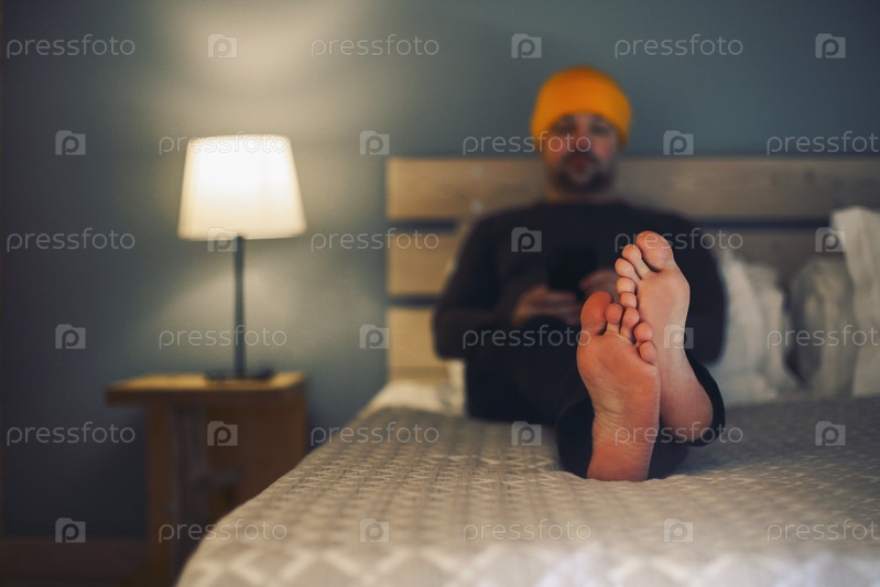 Портрет зрелого красивого бизнесмена, сидящего в желтой шляпе в отеле в деревенском стиле с мобильным телефоном
