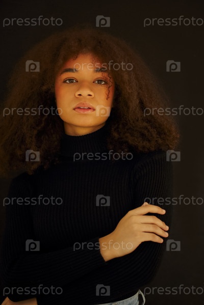 Африканская красота. Улыбающаяся молодая афроамериканка в черной одежде на темном фоне