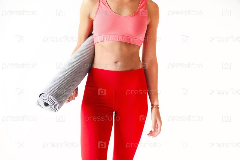 Женщина в спортивной одежде готовит коврик для урока йоги