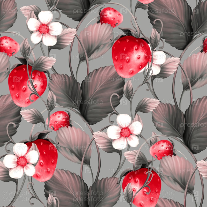 Бесшовный фон с клубникой. Паттерн с ягодами, цветами и листьями