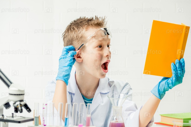 Забавный мальчик в костюме химика с грязным лицом после неудачного эксперимента