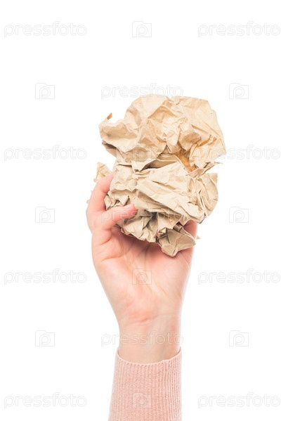 Скомканный лист бумаги в женской руке на белом фоне