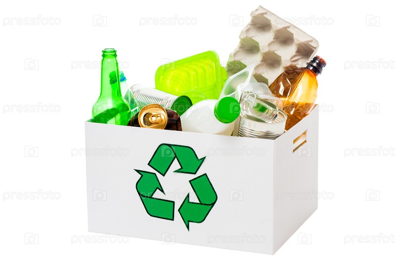 Мусорный бак с бумагой, пластиком, стеклом, металлическими отходами на белом фоне