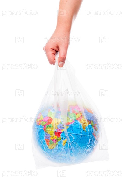 Женские руки держат земной шар в полиэтиленовом пакете
