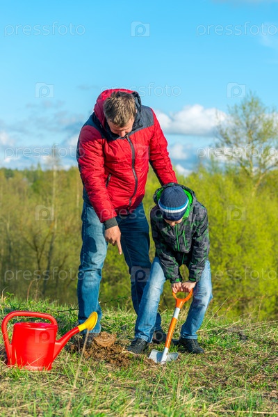 Отец и сын-школьник весной сажают дерево в парке, концептуальная семья, помощь, забота