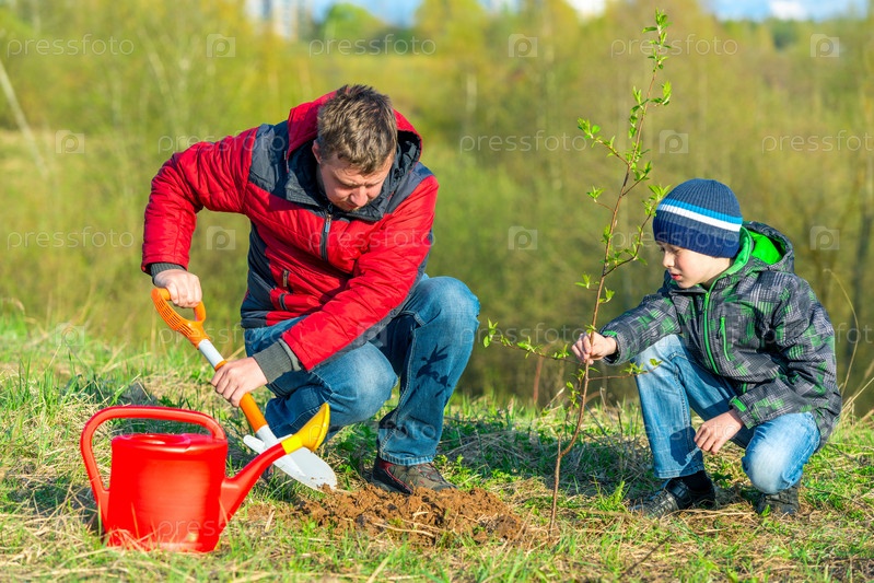 Отец и сын-школьник весной сажают дерево в парке, концептуальная семья, помощь, забота