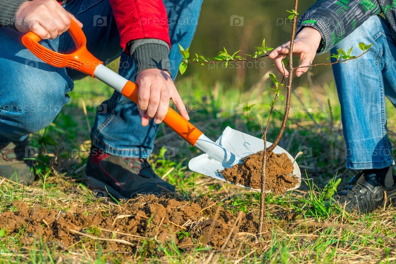 Отец и сын-школьник весной сажают дерево в парке, концептуальная семья, помощь, забота