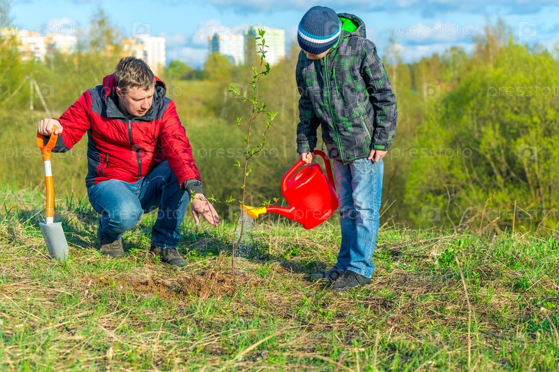 Отец и сын школьник весной поливают деревья стреляют в парке концепция семьи, помощи, единения