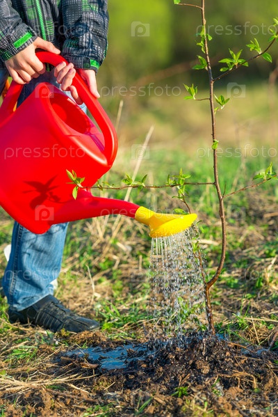 Школьник поливает молодое дерево, посаженное в парке, концепция экологии