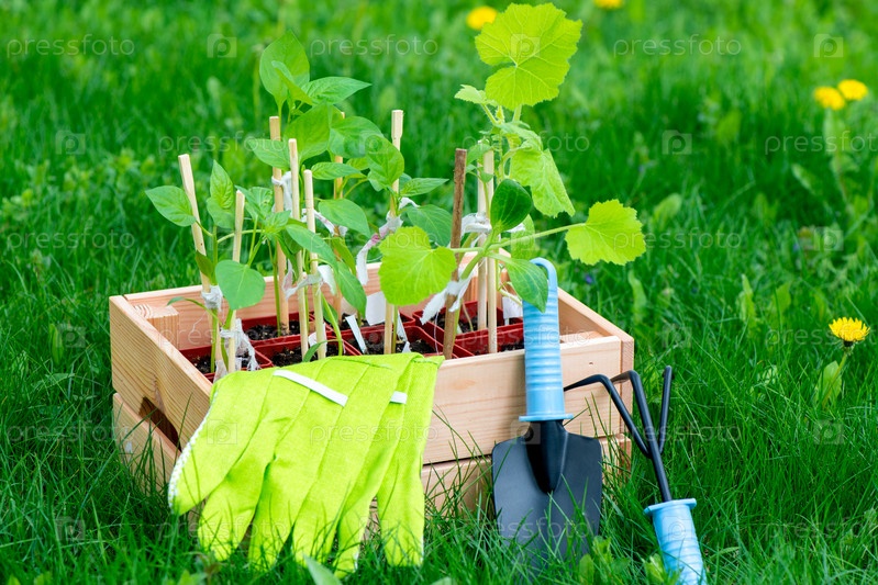 Рассада перца в коробке с перчатками и инструментами для обработки почвы