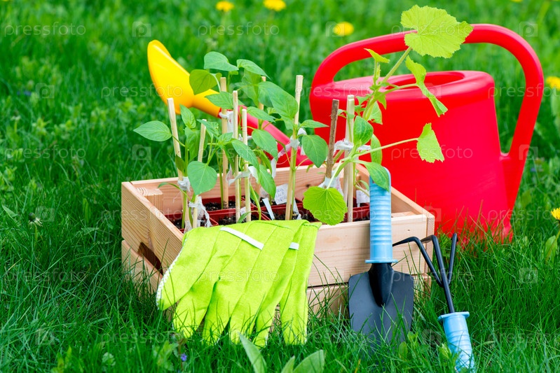 Рассада перца в коробке с перчатками и инструментами для обработки почвы