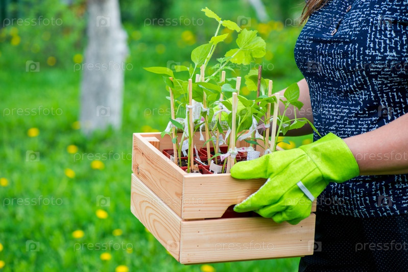 Коробка с маленькими ростками перца, готовыми к посеву в руках самки. Весенняя рассада. Уход за растениями. Полив и пересадка овощей на приусадебном участке