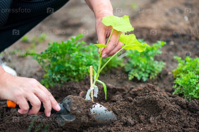 Фермер сажает рассаду огурцов в огороде