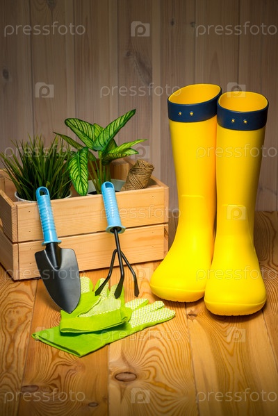 Концепция садоводства, земледелия и посадки - садовые инструменты, саженцы цветов и резиновые сапоги на деревянном фоне