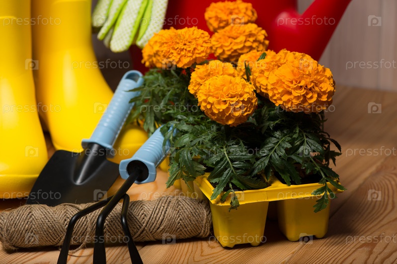 Весенняя концепция, садовые инструменты для садоводства, резиновые сапоги и саженцы, лейка, сезонные садовые работы