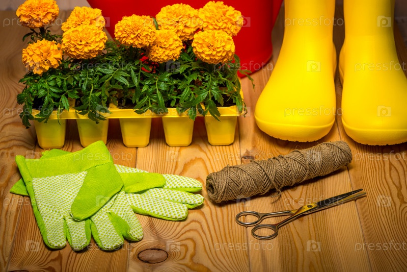 Садовые инструменты для садоводства, резиновые сапоги и саженцы, весенняя концепция - сезонные садовые работы