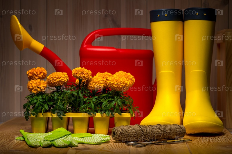 Весенняя концепция, садовые инструменты для садоводства, резиновые сапоги и саженцы, лейка, сезонные садовые работы