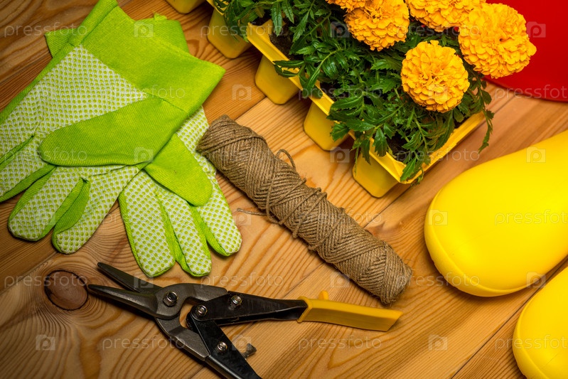 Садовые инструменты для садоводства, резиновые сапоги и саженцы, весенняя концепция - сезонные садовые работы